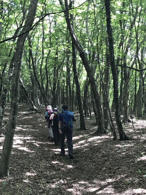 新緑の木漏れ日の中を歩く