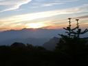 ! ! ! 目の前には、八ケ岳の峰々、南の方から頭を隠した富士山、甲斐駒、仙丈ヶ岳、遠くに御嶽山、雪を被った乗鞍岳、白馬三山、北には浅間山まで一望できた。夕食後(ワイン付き)の日没(7:16)の後の夕焼けがまた素晴らしく、朱や茜色の空の変化に感激し、来られてよかったなぁと思った。