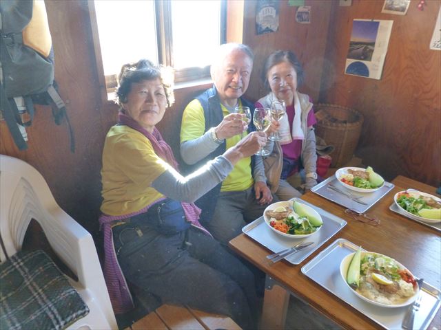 小屋のワイン付食事で乾杯!