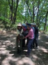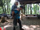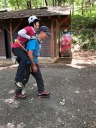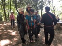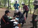 背負う人、背負われる人、交代しながら体験。立ち上がる時に両脇を支えてもらわないとなかなか立ち上がれない。仲間の協力がとても大切でした。 ランチの後、簡易ハーネス姿で日和田山の子供岩に移動。 ここでは登山道から人が落ちた時のロープでの救出の方法を学びました。 木にスリングとカラビナをかけ、ハーフマストで下降し、けが人をロープに結びプルージックでビレイを取りながら、皆で声を掛け合い引き上げました。 イラスト付きで説明書きを送ってくれたKサブリーダーに感謝です。 これもけが人、引っ張る人、搬送する人と何度も変わりながら練習しました。意外と強い力がロープに加わり、グングン引きあげられたのが驚きでした。 初めて体験しましたが、何度かやっていくことが大事と思いました。 暑い中Yリーダー、Kサブリーダーありがとうございました。 参加の皆さまお疲れ様でした。(記:N.U)