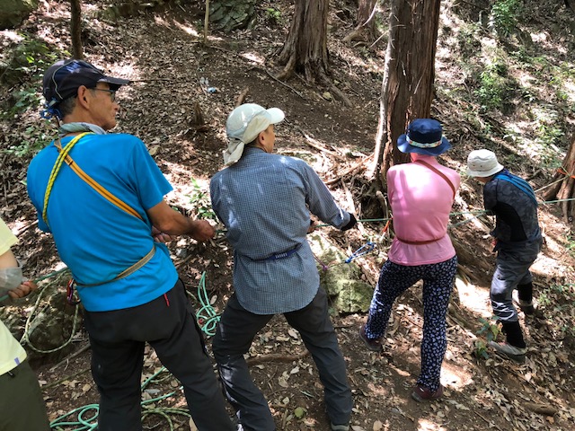 怪我人にロープを結び引き上げる。支点にかけたカラビナで