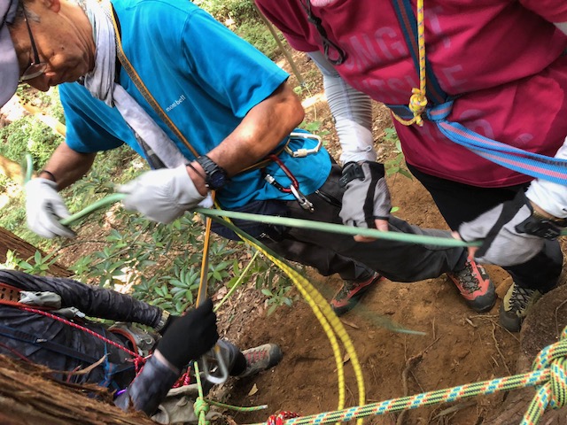 メンバー交代。水色シャツが救助に下りる。自分の簡易ハーネスにロープを結ぶ。