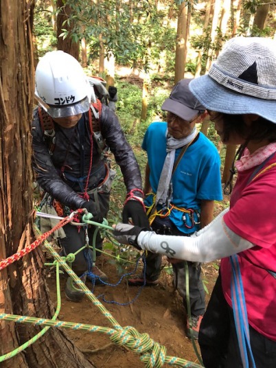 A次に、ロープに全体重をかけて強く引く(支点の強度の確認)