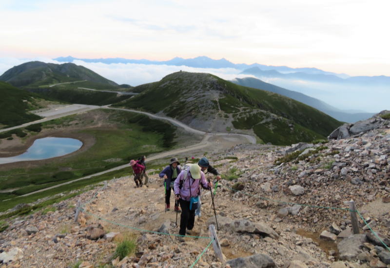 志木駅を5:15出発。乗鞍観光センターに予定通り到着。平日の為か駐車場はガラ空き。予定時刻のバスに乗れ、良かった。車内はとても静か。遠くの山を眺め見ると夏の白い雲と青空が・・・。時折触れる冷気がとても心地よい。