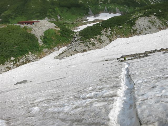 ようやく左上に剱澤小屋が見えた(ずーっと先を行くS.A.リーダー)