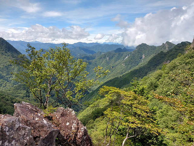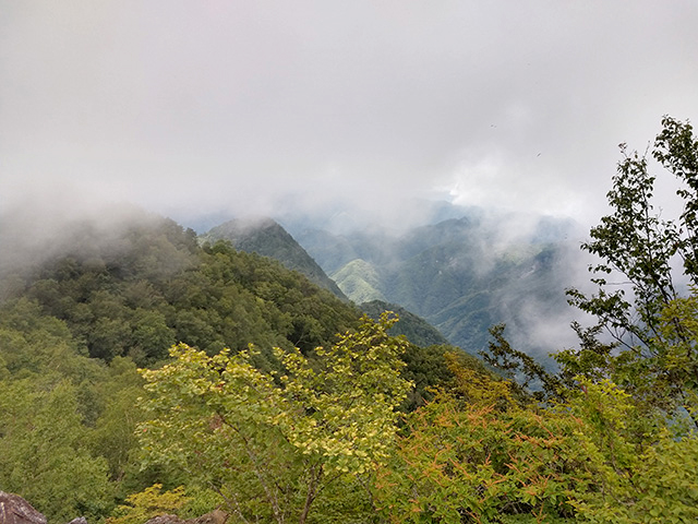 下山を始めると直ぐにカミナリと雨に追いつかれました。稜線上でカミナリは遮蔽物も無く危険だし、ピストンで設定していたルートを雨の中に下りるのも危なそうだし(降って無くても岩が濡れていた)、たとえ油滝まで着いても増水していたさっきの沢がもっとこの雨で水かさを増していたらはたして無事に渡河が出来るのか? と、いろいろ考えた結果、エスケープで用意していた前東岳から天理岳の尾根線の急坂を駐車場まで戻る判断をしました。