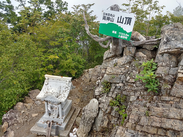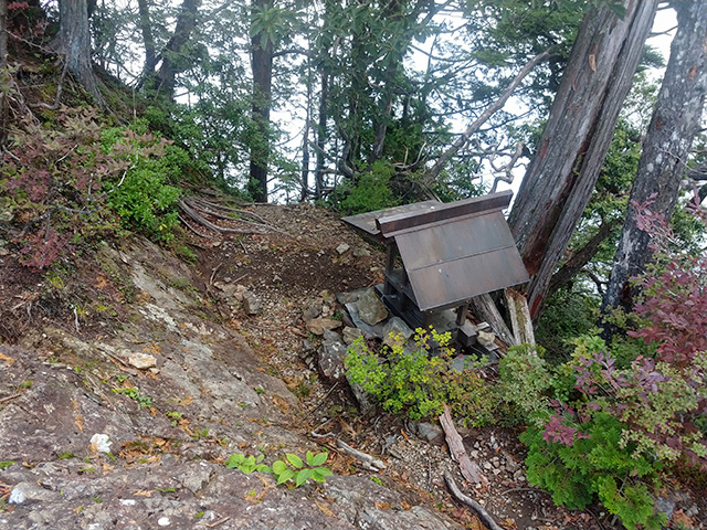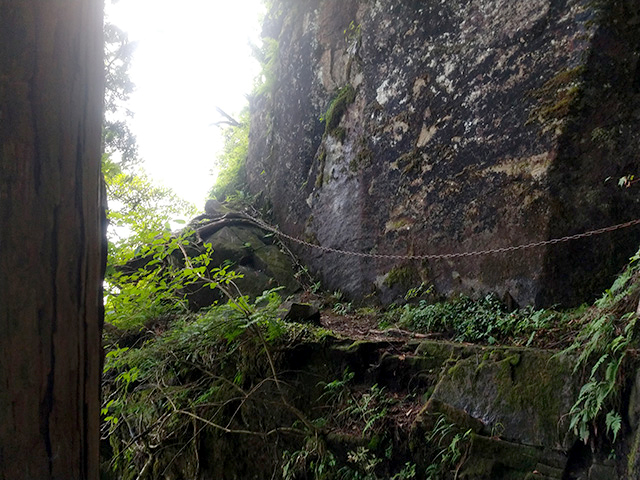 しばらく土の急登を進んだあと岩にハリガネ(゚д゚)!が張ってある登り口から始まり、永遠の鎖場と湿って濡れている岩をいくつも登った頃、龍頭神社奥宮がある西岳と東岳のまん中の稜線に到着しました。