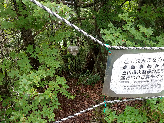 エスケープルートの天理岳道に入ると写真の注意書きの様に管理して無い登山道らしく、リボンやテープがたまにあっても色が抜けて白くボロボロになっていたり、忘れた頃にそれは現れる程度でした。また踏み跡や道筋も雨と落ち葉でかなり不明瞭でした。一応、出発前に過去ココを通った人のgpxファイルをダウンロードしてジオグラフィックカと地図にルートをトレースしてあったので逐一、地図とスマホで現在位置を確認しながら進みました。天武将尾根途中の禿岩から天理岳の間で今日最大のカミナリと大雨に見舞われながらも後ろに戻る選択肢も無く、