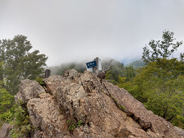 そしてゴロゴロとカミナリの音も聞こえてきました。この時、清滝小屋の登山道方向から人の話し声が聞こえていて、山頂でカメラのシャッターを頼もうかとも考えたのですが、まだ声は遠い感じだし、今にも雨が降りそうだし、