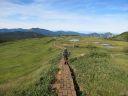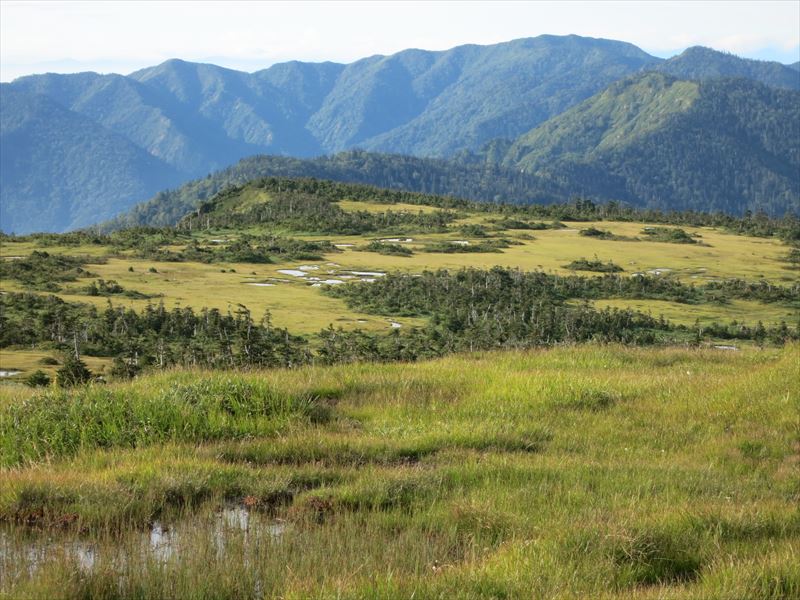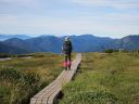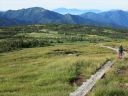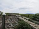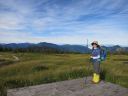 途中から岩場もあり、クサリ場は6~7箇所ありましたが、鎖に頼らなくても登れる所がほとんどでした。雨で滑る時は必要なのでしょう。7合目あたりから空気もさわやかとなりますが、8合目までは結構急登でした。8合目を過ぎ少し行くと、パッと視界が開け湿原が現れ、わーっ!と声が出ました。池塘があちこちに見られ、はるかに続く平たんな山頂湿原が広がります。本当に天空の楽園です。木道をテクテク、ポクポク歩いて行きます♪木道は出来たばかりのきれいなところもあれば古いものもあり、朽ち果てた箇所もありました。テクテク、ポクポク・・・これでもかと続く高層湿原を歩いて行くと今夜泊まる山頂ヒュッテ、別名苗場山自然体験交流センターが見えてきました。山頂はいったいどこなのでしょう!?あっち、いや戻ろう、小屋から1分のところに山頂の標がありました。こんなに山頂が目立たない山も珍しいかもしれません。