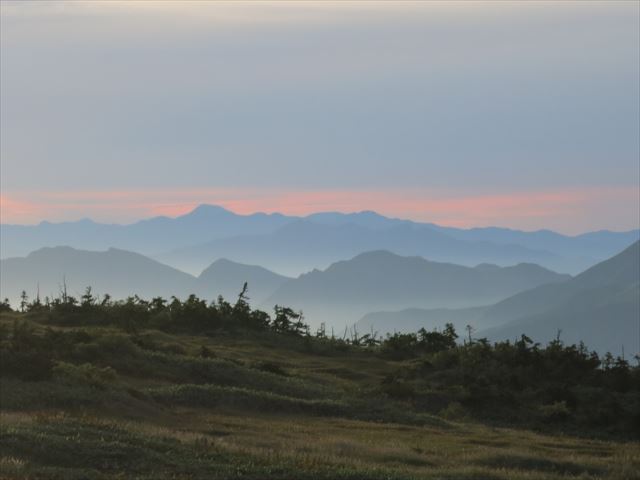 朝焼けと山々が重なって美しい~~