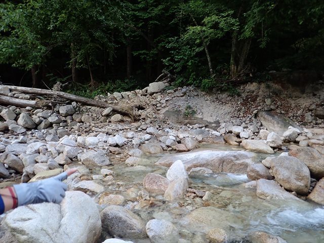 2年前の記憶を頼りに松川登山口から入山するが、なんかおかしい。地形が変わっている。沢沿いから山間に入っていく登山道が消滅しており、護岸工事や堰てい工事のための道がつけられている。最初は意味が分からず、残置されているピンクリボンの行方を追って道を探したが、大雨にやられて道が崩れ失くなっていることに気づき直接沢沿いを歩き第1渡渉地点を探す。
