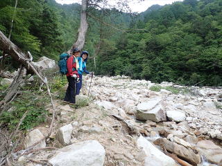 この山行は実は2年前に挑戦した山行である。故YSさんとの4人で前日に穂高駅の近くの宿に泊まり、タクシーで登山口まで行ったのだが第1渡渉地点の増水であえなく30分で撤退を余儀なくされた。天気は良かったのだが夜間通り雨が降ったのだった。帰るとき丁度、松川村の消防団の有志の方が登山道の整備に来ていて埼玉からこのルートを登りに来たと言ったらとても喜んでくれた。有明山は有明荘からピストンで登ることが多いためこちらからの登山者は少ないのだ。