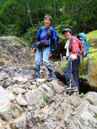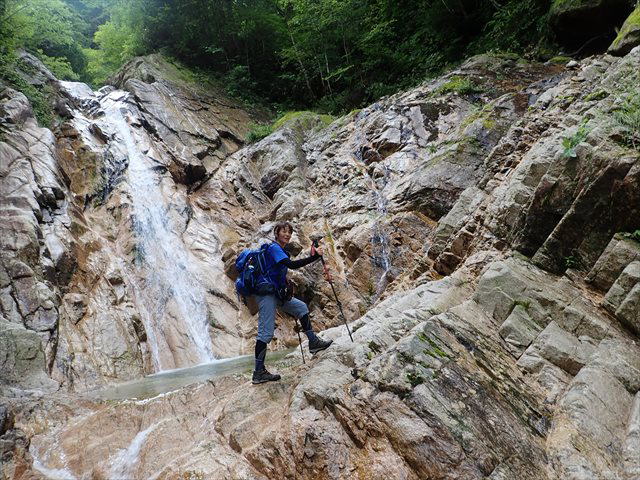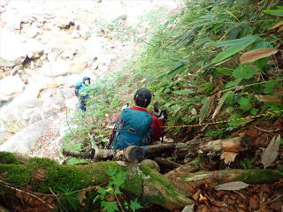 最初から時間がかかってしまい、よもやダメかと思ったが、沢の水量は問題なく、何回も渡渉を繰り返し道を探しながら登って行った。沢から離れると登山者が少ないせいもあり、背丈を越える笹薮漕ぎの急登が続き、道もわかりにくい。ときおりピンクリボンのマーキングが正しい道であることを教えてくれる。松川村の有志の方が整備してくれていてとても有難い。