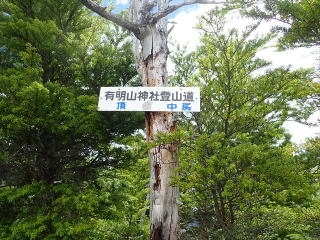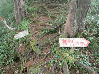 不動の滝からは沢を離れて急登が続き、やっと落合に着くと右下の標識があります。有明方面は山頂方向ではありません、念のため。