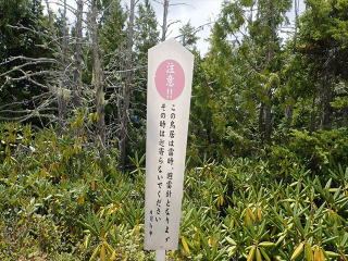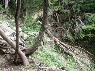 下山路は有明荘方面を下る。こちらもなかなか急な下りであった。途中崩れているところもあり、やはり雨の影響なのか、根こそぎ大木が倒れていた。でも、このルートは宿の人達が整備しているためこれでもかというほど標識があった。松川ルートには1個もなかったのに。・・・