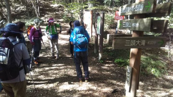 ムシカリ峠で、どちらに下りるか相談中。三頭大滝に下りることになりました