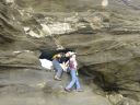 城ヶ島公園の手前からハイキングコースを進む。左側眼下に荒磯を見ながらおよそ10分位で磯に降りる階段があるので降りてみると奇岩の「馬の背洞門」があり自然のパワーを感じる。ここでおやつタイムをとり、磯伝いに城ヶ島灯台を目指す。