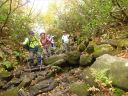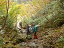 尾瀬ヶ原、竜宮十字路に向かって長沢新道を下る、この下りの木道は傾斜があり滑らないように注意しているつもりが2度も滑ってしまった。石ころの道、木道を繰り返しながらやがて右手から沢の水音が聞こえ、樹間から景色が見え真っ赤な実をつけたナナカマド、黄葉の木々がとても綺麗。竜宮丁字路までまっすぐ伸びたパノラマが広がってきた。