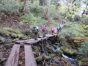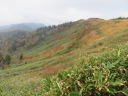 小屋7:00出発、今にも雨が降りそうな天気の中、1時間程木道を歩き、山際まで水が来ている尾瀬沼を左手に見ながら、晴れていれば湖面の上に見えるであろう燧ケ岳が残念ながら真っ白で何も見えない道を沼尻へ向かい南岸コースを歩く。ぬかるみなど足場が悪い。霧雨が降ってくる。尾瀬沼休憩所でゆっくり昼食をとり三平峠へ、この道は小さな滝もあり渓流ありと足元も悪く結構歩きにくい。