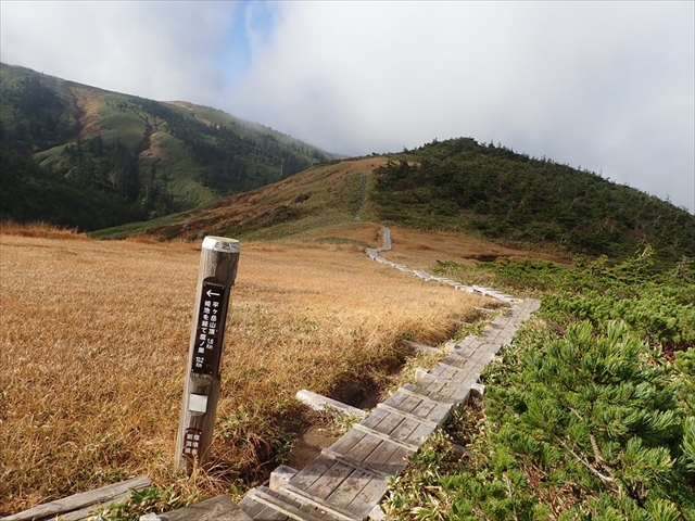 木道が終わり、しばらく登ると山頂でした。山頂付近も湿原なのですが、山頂の標識は、木に囲まれた袋小路みたいなところにあり、イメージと違いました。