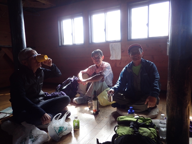 お決まりの頂上酒(ワイン)で乾杯、のんびりと昼食を済ませてから頂上を経由して周回コースで下山しました。