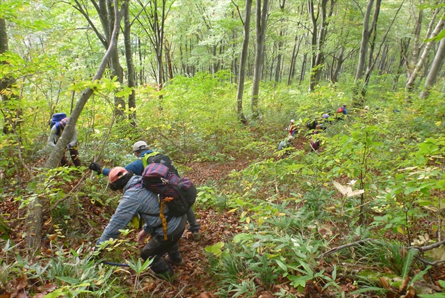 ブナ高木林の中、粘土道を急降下