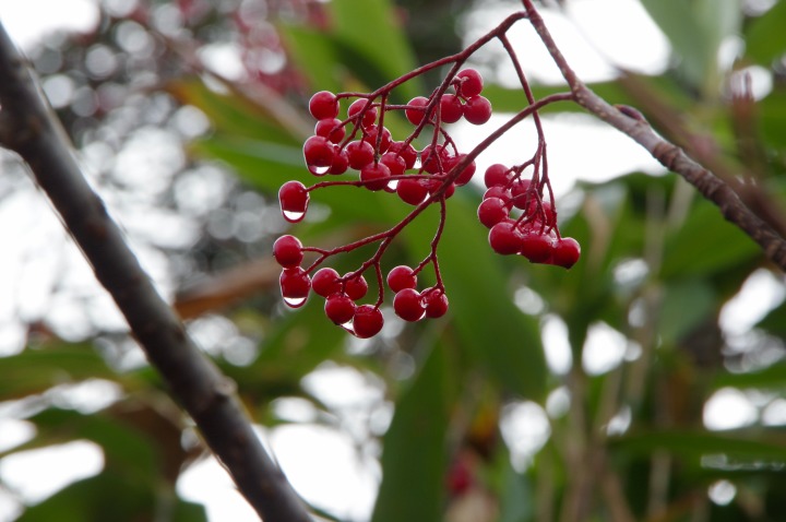 雨雫に輝くなナナカマドの真紅の実