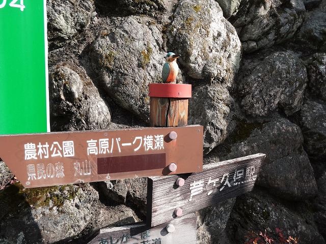 果樹園公園村入口の道標の上にはカワセミがチョコンと載っています