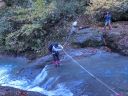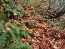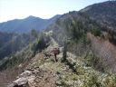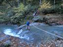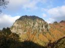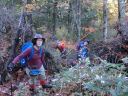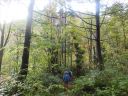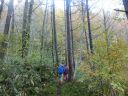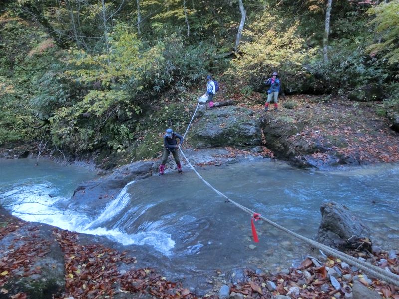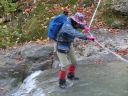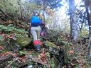 林道が終わったところからずっと山道を下って行ったら、川にぶつかった。見ると流れが急で川幅も広く、深そうなところもあった。スパッツをつけていたのでロープにつかまりながら渡ってみたら、靴も濡れないで渡ることができた。そこからは、ずっと急な登りが続き、時々なだらかなところがあったりした。ブナの紅葉がきれいだった。
