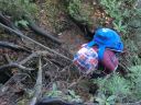 川のところまで下り、またロープにつかまりながら通過し、無事に渡渉ができた。ドキドキだった。長い登りが終わると、また長い長い林道歩きだった。山道に入ったところでヘッドランプを点け、無事にドロノ木登山口に下りた。17:42だった。今日の歩行時間は、休憩も含め、なんと13時間だった。