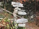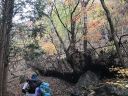 小屋でカッパを着て下山しましたが、雨でも落ち葉を踏みながらの快適な尾根歩きでした。ゴールの東日原バス停には予定時刻よりもかなり早く到着し、屋根がかかり隣にはキレイなトイレがあるバス停のベンチでしばらく休憩タイム。先頭のY.Y.さんに頑張って?ついていったせいか、休憩を含めてもコースタイムより早いペースで歩くことができ、「雨だったけどいい山行だったね~」と口々に感想を言いあったのでした。確かに、登り始めと山頂付近は急登でしたが、間の尾根道は快適で、今度は新緑のころにまた来たいと思わせる山でした。さらに、奥多摩駅までのバスの車窓から見える渓谷沿いの紅葉がとてもとても素晴らしく、(写真にはありませんが)ますます好感度アップの山行になりました !(^^)! (K.A. 記) |