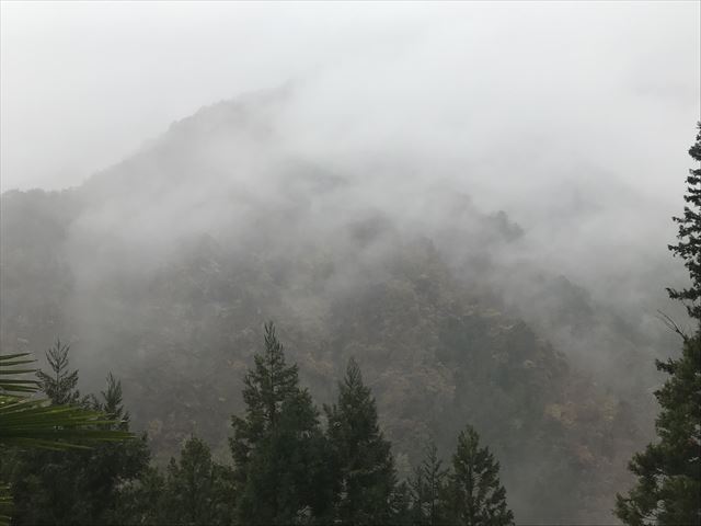 ゴールの東日原バス停付近 霧に覆われた山が美しい。。。