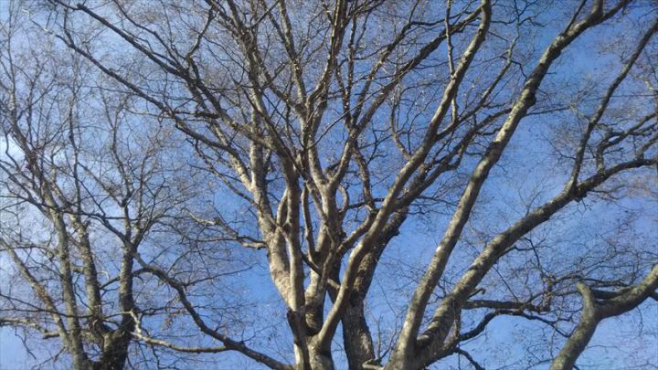 葉の落ちた木々の枝と青空