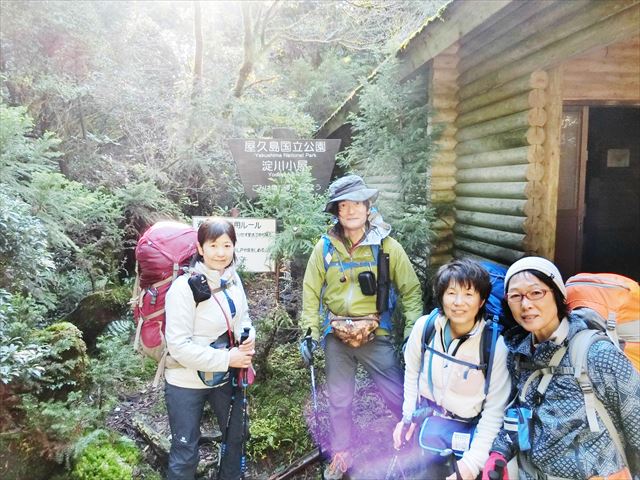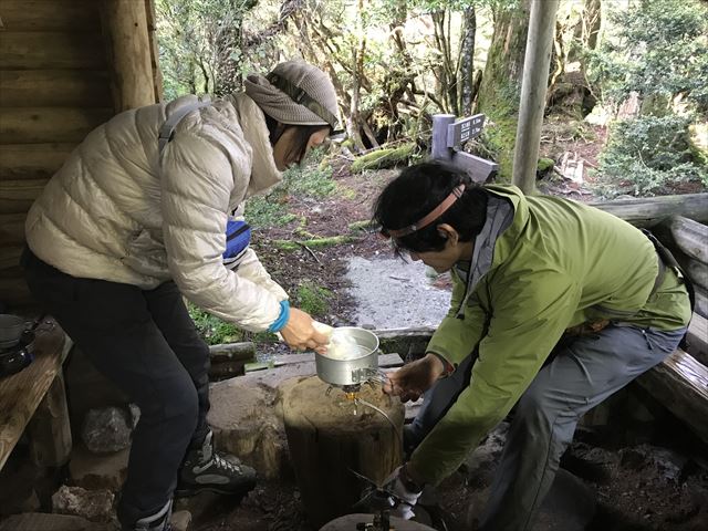 淀川小屋に到着。無人小屋で電気がないので、明るいうちに夕食の準備に取り掛かります。南の島ではあるのですが、寒いです。