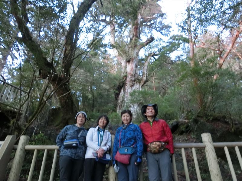 縄文杉で明るくなるのを待ちます。今までの杉も大きかったですが、縄文杉は倍以上の大きさがあり、別格です。デッキ状の遊歩道が整備されており、近づくことはできません。