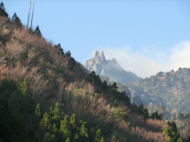 翁杉。昔は立派な大木だったことでしょう。昨日のぼった栗生岳が見えました。
