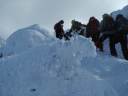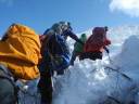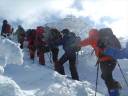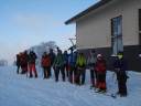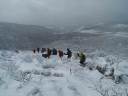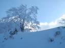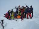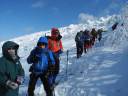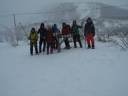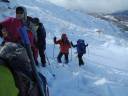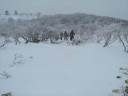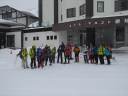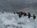【メンバー】 CL:Y.Y SL:M.K H.Y、S.N、T.M、H.S、Y.S、K.Y、Y.I、T.Y、N.U、J.K、M.S、K.O、M.M、K.A、K.M(17名) 【コースタイム】 1日目 マウント磐梯発11:15 旧土湯峠12:20 鬼面山着13:35 鬼面山発13:45 旧土湯峠14:45 マウント磐梯着 15:35 2日目 マウント磐梯発8:25 リフト乗り場8:35 リフト終点8:50 箕輪山着11:15 箕輪山発11:30 リフト乗り場上13:25 マウント磐梯14:15 【コメント】 初日、マウント磐梯到着後、昼食を食べて身支度を整え、二班に分かれ、鬼面山に向かって出発する。表面がサクサクと音のする雪面を踏みしめ、リーダーに続く。スノーシューを履いて登るメンバーもいたが、滑りそうで怖くて、私はアイゼンで登った。 秋田出身の私は、こんな堅雪の上を、道路と違うところを横切って歩くのが好きだった。子供だった私は、潜り込むこともなく、雪の上を軽々渡れたものだった。しかし、大人になって体重が増しているので、場所によっては深くはまり込んでしまう。 今回私は「会員ナンバー1番」のN先輩の後だった。木の近くを通ると、その下が空洞になっていることがあると教えていただき、「こういうところを選ぶといいよ」と直接指導をいただけた。登りはアイゼンを蹴るようにして雪面に前歯を引っかけ体重を乗せる。 下りはかかとで踏みしめるようにしながら降りる。少しかかとを滑らせ、最後に踏みしめれば必ず止まる。急いで降りる方法まで教えていただいた。 登りは背中に背負っていたピッケルが木の枝をくぐる際何度も引っかかる。「あれっ?」と振り返るのと同時に、後ろのMさんが何も言わず枝を持ち上げてくださっている。さすが、紳士だな~とありがたく甘えさせていただく。 スノーシューの方たちが前を歩き踏み固めていただいたおかげで、無事皆何事もなく鬼面山山頂に到着することができた。 夜はいつもの山小屋とは違い、豪華な夕食と温泉を楽しみ、次の日もゆっくりなので、皆で部屋にお酒を持ち寄って交流を楽しむ。危うく登山に来たことを忘れてしまうような、のんびりした時間を楽しむことができた。 二日目、しっかり朝ごはんを食べ、リフトで途中まで登り、アイゼンとピッケルで装備を整え、いざ出発。昨夜降り積もった雪がアイスバーンを覆っていたが、登り始めた頃は天候も良く風もなく歩き出すと汗ばむほどだった。 まさに道なき道を行く。木と木の間のしっかり雪が積もったところを選ぼうとしても、密集した辺りはどうしても下の空洞が多く、皆何度も足を取られる。中には胸まで落ちる人もいて、助け合いながら、予定より大幅に時間がかかりながら進む。 今日も私はN先輩の後。ピッケルの使い方を教えていただき、足が沈み込んでも支点がしっかりしていたので、膝より下が深みにはまることはなかったし、一度尻もちをついたが、ピッケルで支点を確保できたおかげで、自力で立ち上がることができた。 山頂にようやくついた時には風が出ていた。写真を撮ろうとグローブを外しただけで、あっという間に手がかじかんでしまうほどで、集合写真を撮って早々に下山を開始するが、雪が降り靄がかかり、そう遠くないはずのスキー場が全く見えなくなる。 風が直撃し、鼻が凍りそうになる。ネッグウォーマーを引き上げ、鼻まで覆う。グローブを3枚重ねにしていても、指が凍りそうになるので、時折指先を曲げ伸ばしして温める。 秋田出身の私でも、山の中でこの光景には出会ったことがない。慣れた道で方角がはっきりしていればよいが、今はどの方向が正しいのか半信半疑。リーダーを信じて背中を追う。 下山はより一層深みにはまりながら、予定よりも大幅に時間がかかりながらも、皆黙々と足を運ぶ。途中立ち休憩でパンをかじりながら、ひたすら無事下山できることを信じながら、 かすかにスキー場の音が聞こえた時の感動と言ったらなかった。あんな中で方向を見失わず、皆を引っ張ってくださったリーダー、本当にありがとうございました。 山の天気の変化の怖さと、ホームページに書けない経験も含め、今までにない、貴重な体験をすることができました。この経験を今後に生かしていきたいと思います。 記:M.S |
