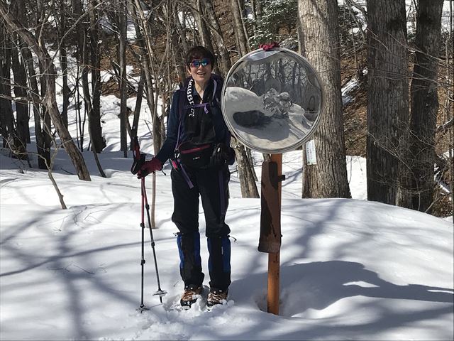 林道のカーブミラーが雪に埋もれて、M.S.さんと同じ高さに!