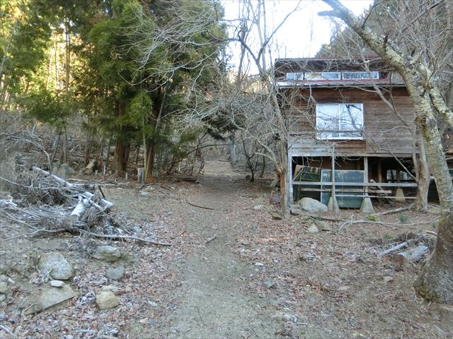 林道から右に曲がる寂しょう尾根の入り口。分かりにくく注意。しばらく歩くと小屋がでてくるので、その横を進む。