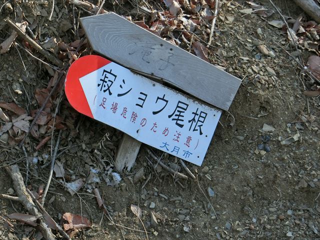 尾根と沢を歩くコース。尾根は林の中、沢は大きな石や倒木で荒れている。初狩駅は笹子駅よりも130m低いのと、初狩駅の前にはコンビニがあるので、下山に使う方がお勧め。特に、下山後に喉を潤したい方には。