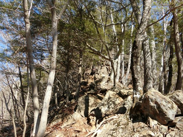 寂しょう尾根は、急登、平坦な道が交互に出てきて現在地が分かりやすかった。後半の岩場は、地図ではよく分からず。尾根に出た後、1つピークを越えて、2つ目が山頂と思ったら、実際には3つ目が山頂だった。