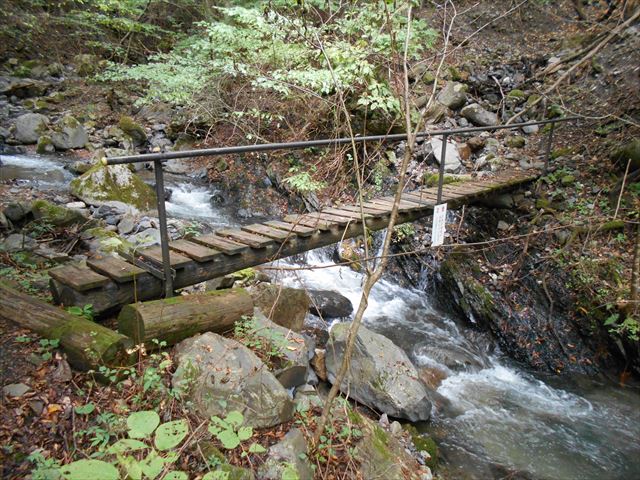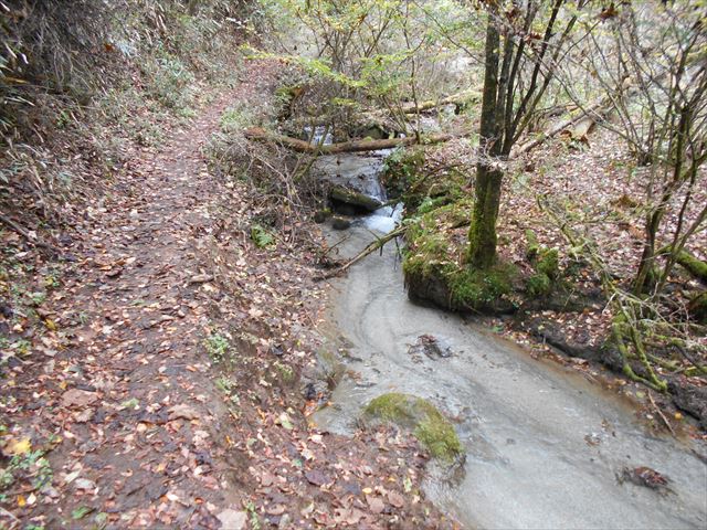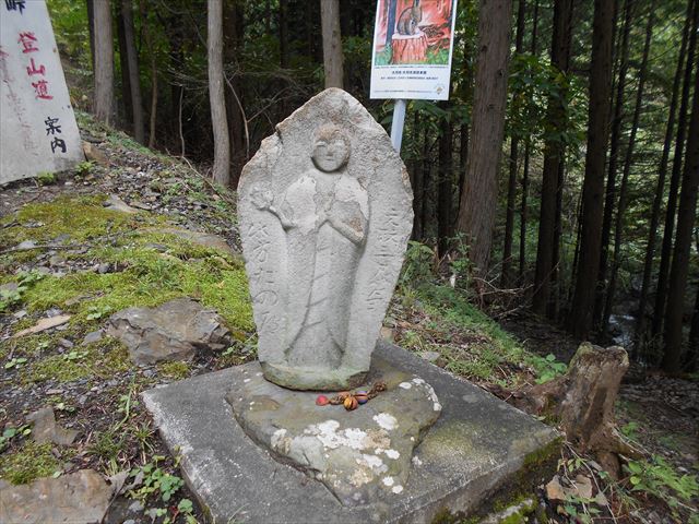 道証地蔵から登山道に入る。沢沿いに歩き、途中小川に沿ってしばらく歩く、山の中とは思えない不思議なコース。勾配が緩やかな分、距離が長い。