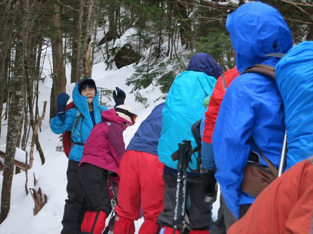 リーダーのKYさん「山頂部は強風と雨のため夏沢峠で引き返します」と指示