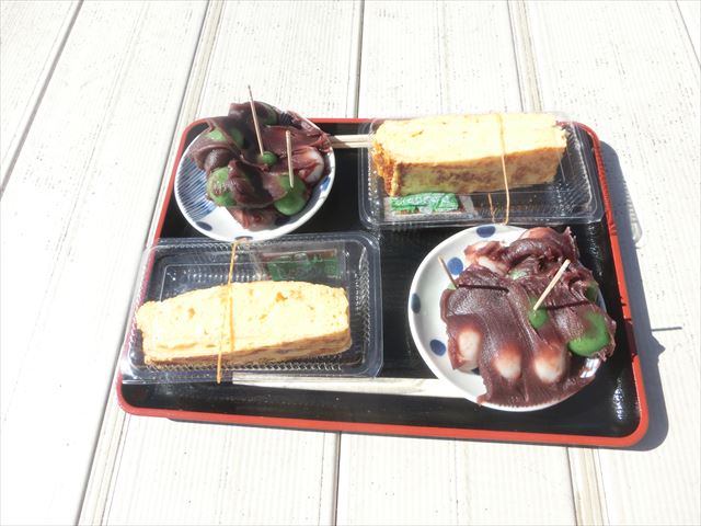 茶店で買った団子と卵焼き