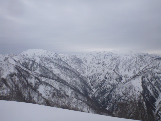 初雪山の右手奥に雪尾根が続く