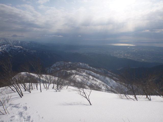 雲間から差し込む光で輝く富山湾に向かってくだる