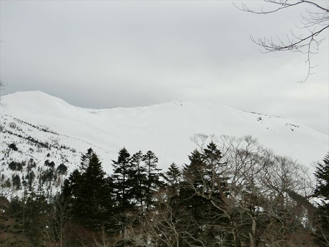 今年は雪が多く、鳩待峠小屋横のベンチは雪の下。登山口から登り始めます。山頂方面も真っ白。