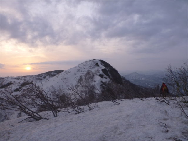 白神岳東緩斜面を下る、南西強風、目の前は朝日と玄関岳