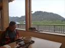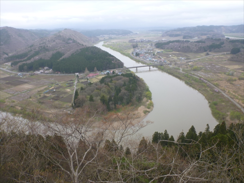 26)は「増水した米代川を小舟で渡っている最中のに隣の大型船から7人が水に落ちた」と書いていた。今日も雪解けと雨で水量が多い。記念撮影のため青空を映す川面を望んだが無理な相談であった。